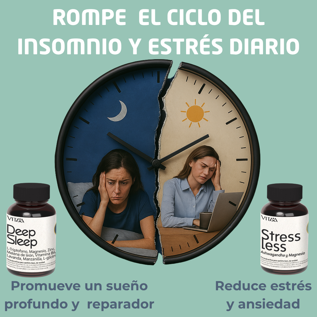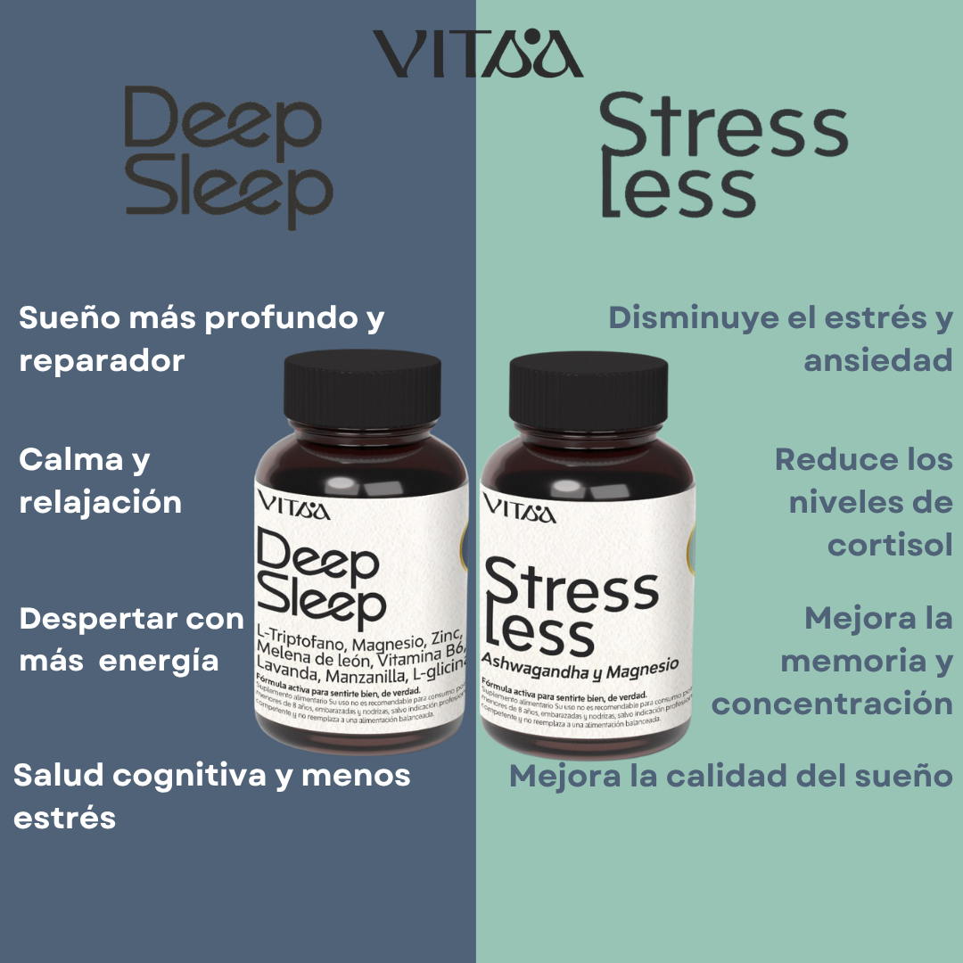El pack Deep Sleep +Stress Less rompe el ciclo de insomnio y estrés diario: durante el día, Stress Less ayuda a regular el cortisol y reducir la tensión, manteniendo calma y