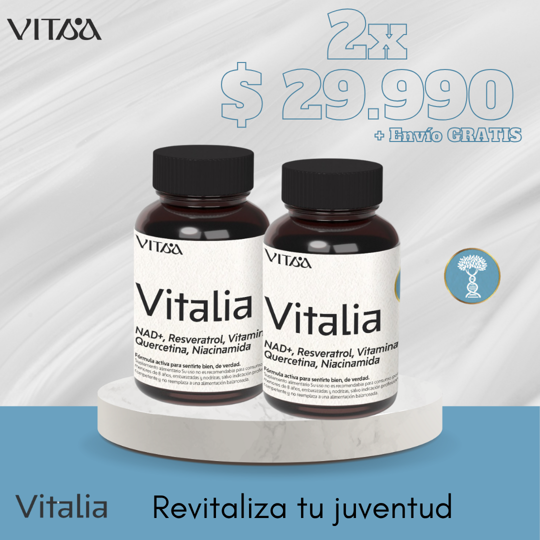 Vitalia combina NAD+, Resveratrol, Quercetina y Vitamina C para entregar una defensa antioxidante avanzada, optimizar la regeneración celular y mantener tu energía en su nivel más puro.